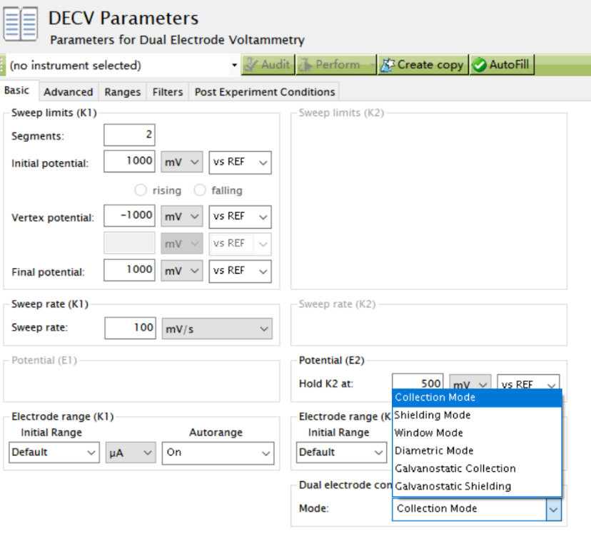 Collection Mode:盤電極設(shè)置CVLSV方法,環(huán)電極設(shè)置恒電壓CA方法;
