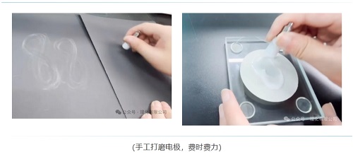 傳統(tǒng)手工打磨電極的方式是“8字軌跡法”,在600目、1000目、2000目砂紙、麂皮等材質(zhì)上反復(fù)打磨,通常要耗時(shí)1-2天時(shí)間,重復(fù)繁瑣的手工打磨不僅手部酸痛,也非常煎熬心力。