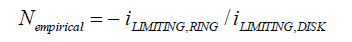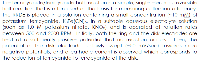 Nempirical的測試方法可以用標(biāo)準(zhǔn)鐵氰化鉀溶液測試,在旋轉(zhuǎn)條件下測試極限環(huán)電流iLIMITING,RING和極限盤電流iLIMITING,DISK,二者絕對值比值是Nempirical。