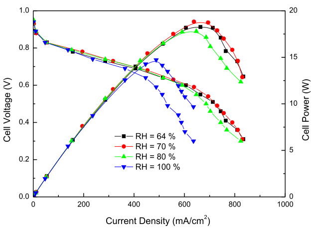 當相對濕度從64%增加到70%時,0.4 V電壓下的電流密度從764 mA/cm2增加到790 mA/cm2,在0.7 V電壓下,從405 mA/cm2到453 mA/cm2。