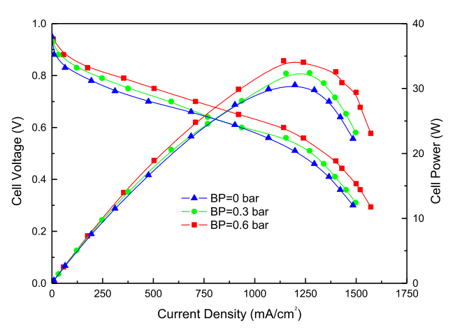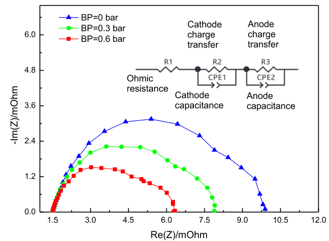 在較高的背壓下,使氣流飽和所需的水,比低背壓下所需的水少。證實了較高的背壓下,質(zhì)子膜的加濕性和導電性得到改善,從而降低了歐姆電阻和陰極電荷轉(zhuǎn)移電阻。