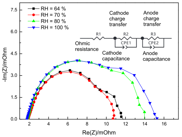 在相對濕度為64%時,Nafion型膜無法吸收足夠的水分以獲得適配的水合作用,從而影響離子電導率,從而產(chǎn)生更高的電池電阻。