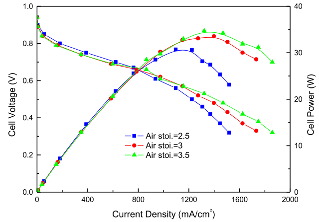 當進入流道的空氣流速增大時,電化學反應更平穩(wěn),整體性能更好。然而,在低電流密度范圍內(nèi),空氣化學計量比為2.5時表現(xiàn)出較好的性能。這可能是由于流速較慢,水合條件較好,對空氣量的需求較低。