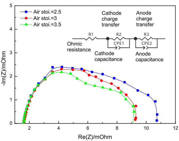 空氣化學計量量為2.5時陰極電荷轉(zhuǎn)移電阻最高,隨著空氣化學計量量從3提高到3.5,陰極電荷轉(zhuǎn)移電阻從5.36 mΩ僅變化到5.5 mΩ,幾乎無變化。